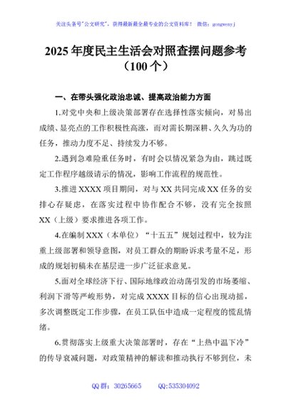 / 2025年度民主生活会对照查摆问题参考(100个)