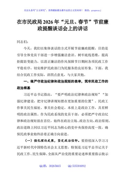 / 在市民政局2026年“元旦、春节”节前廉政提醒谈话会上的讲话