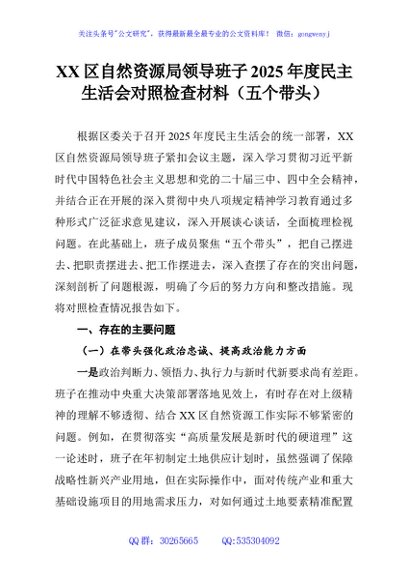 / XX区自然资源局领导班子2025年度民主生活会对照检查材料(五个带头)