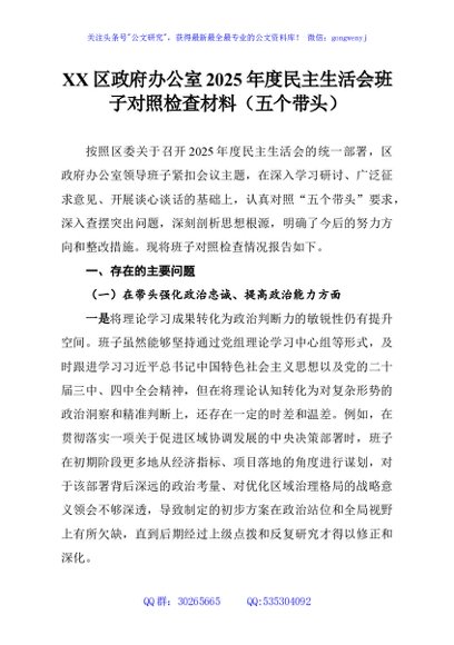 / XX区政府办公室2025年度民主生活会班子对照检查材料(五个带头)