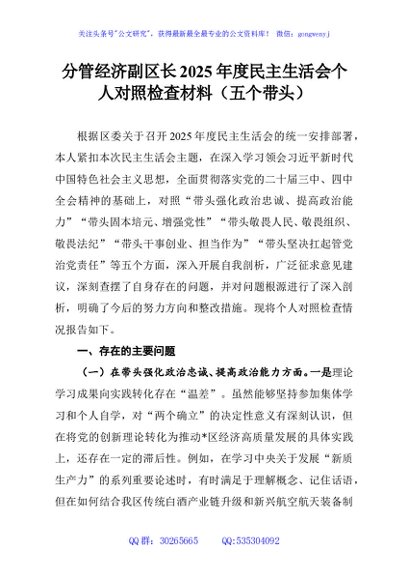 / 分管经济副区长2025年度民主生活会个人对照检查材料(五个带头)