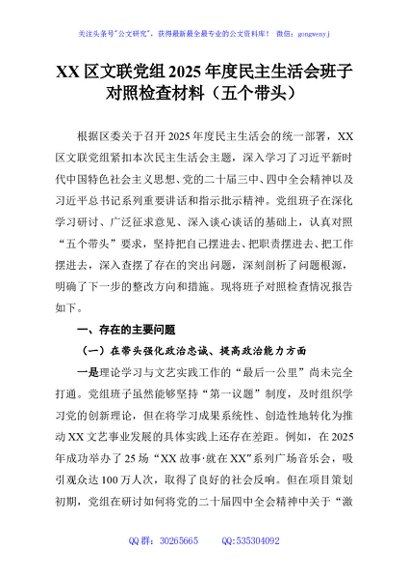 / XX区文联党组2025年度民主生活会班子对照检查材料(五个带头)