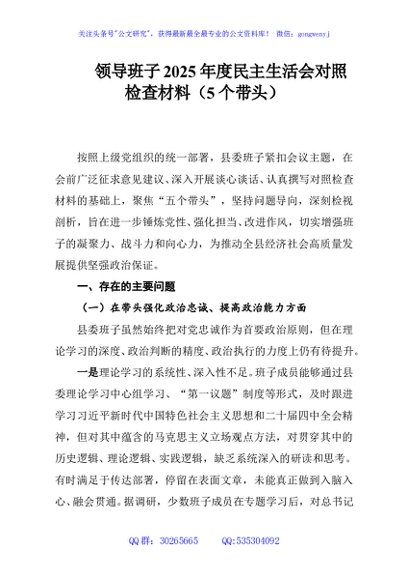 / 领导班子2025年度民主生活会对照检查材料(5个带头)