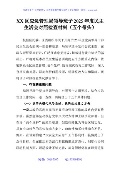 / XX区应急管理局领导班子2025年度民主生活会对照检查材料(五个带头)