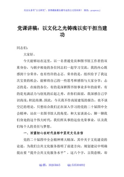 / 党课讲稿:以文化之光铸魂以实干担当建功