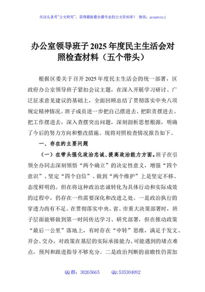 / 办公室领导班子2025年度民主生活会对照检查材料(五个带头)
