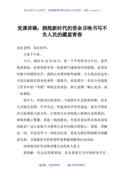 / 党课讲稿:拥抱新时代的使命召唤书写不负人民的藏蓝青春