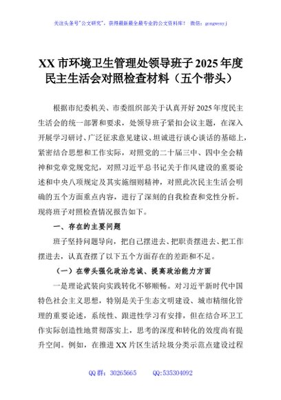/ XX市环境卫生管理处领导班子2025年度民主生活会对照检查材料(五个带头)
