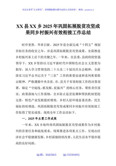 / XX县XX乡2025年巩固拓展脱贫攻坚成果同乡村振兴有效衔接工作总结