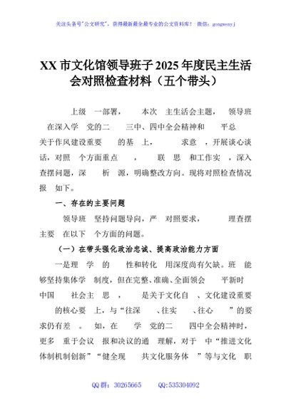 / XX市文化馆领导班子2025年度民主生活会对照检查材料(五个带头)