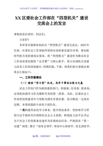 / XX区委社会工作部在“四型机关”建设交流会上的发言