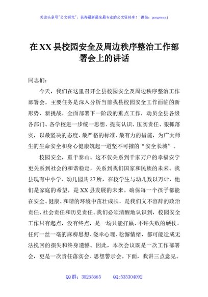 / 在XX县校园安全及周边秩序整治工作部署会上的讲话