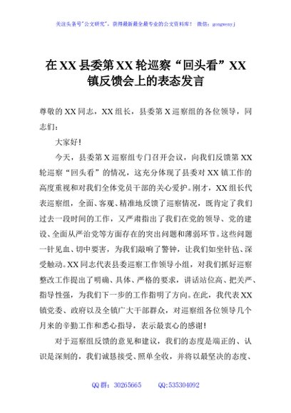 / 在XX县委第XX轮巡察“回头看”XX镇反馈会上的表态发言