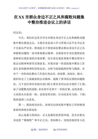 / 在XX市群众身边不正之风和腐败问题集中整治推进会议上的讲话
