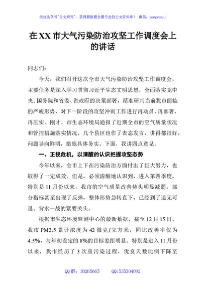 / 在XX市大气污染防治攻坚工作调度会上的讲话