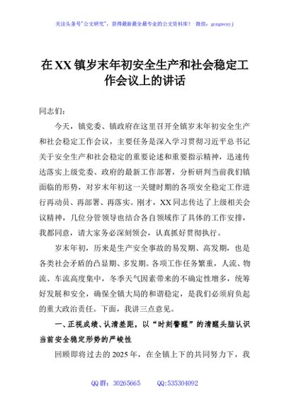 / 在XX镇岁末年初安全生产和社会稳定工作会议上的讲话
