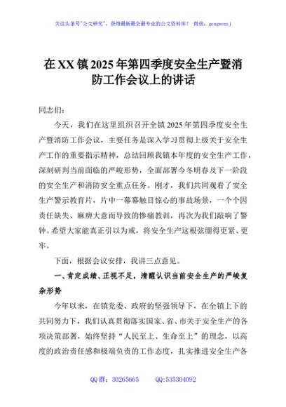 / 在XX镇2025年第四季度安全生产暨消防工作会议上的讲话