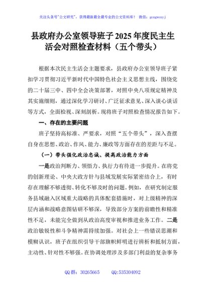 / 县政府办公室领导班子2025年度民主生活会对照检查材料(五个带头)