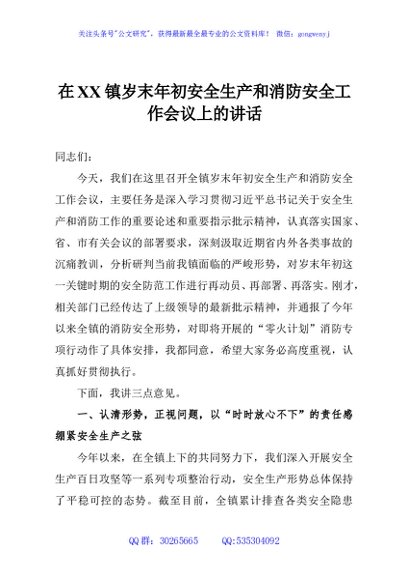 / 在XX镇岁末年初安全生产和消防安全工作会议上的讲话