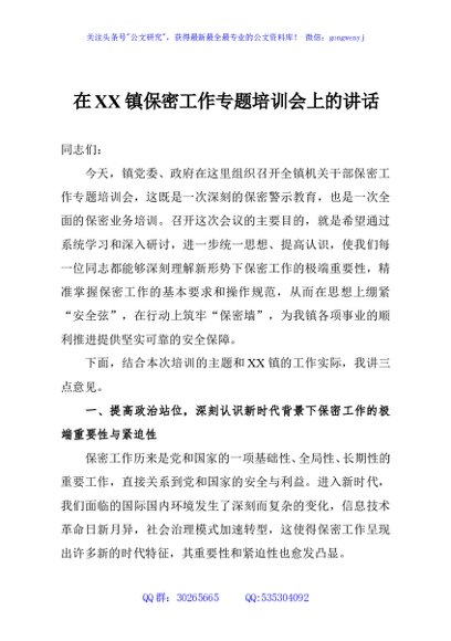 / 在XX镇保密工作专题培训会上的讲话