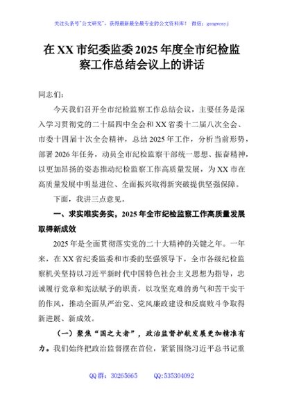 / 在XX市纪委监委2025年度全市纪检监察工作总结会议上的讲话