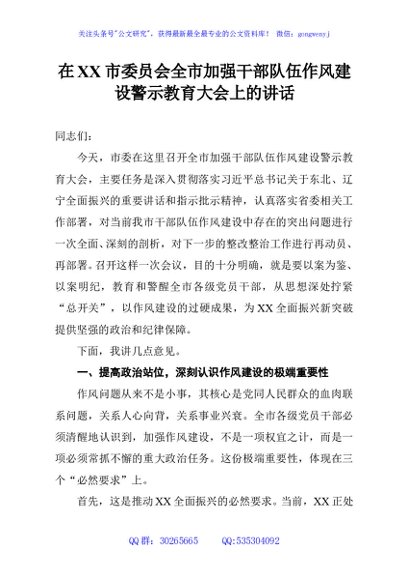 / 在XX市委员会全市加强干部队伍作风建设警示教育大会上的讲话