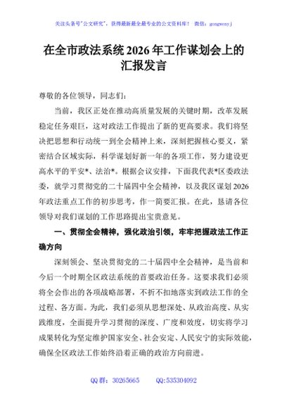 / 在全市政法系统2026年工作谋划会上的汇报发言