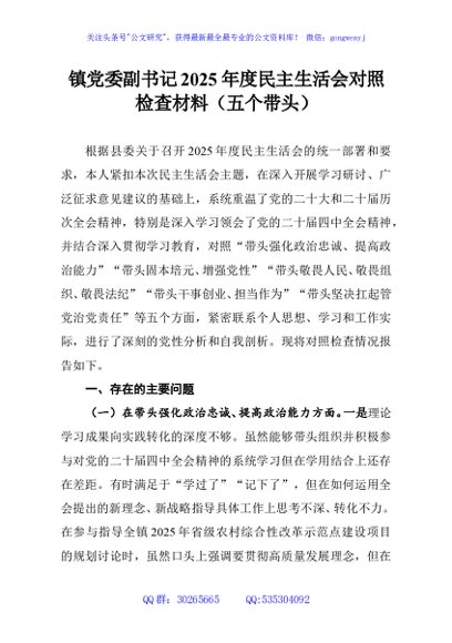 / 镇党委副书记2025年度民主生活会对照检查材料(五个带头)