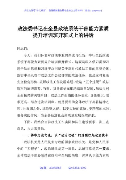 / 政法委书记在全县政法系统干部能力素质提升培训班开班式上的讲话