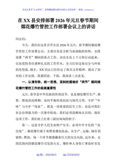 / 在XX县安排部署2026年元旦春节期间烟花爆竹管控工作部署会议上的讲话