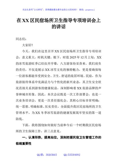 / 在XX区民宿场所卫生指导专项培训会上的讲话