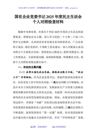 / 国有企业党委书记2025年度民主生活会个人对照检查材料