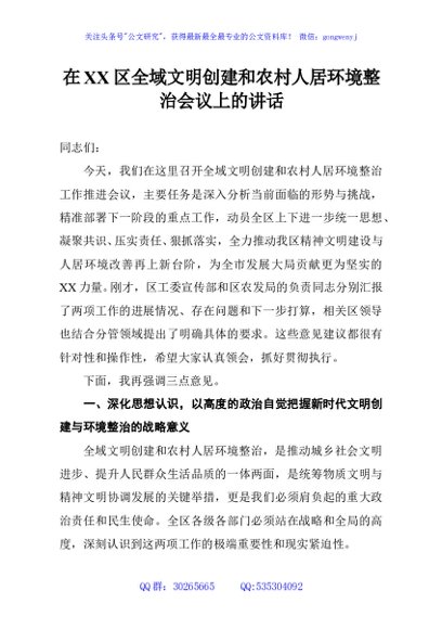 / 在XX区全域文明创建和农村人居环境整治会议上的讲话