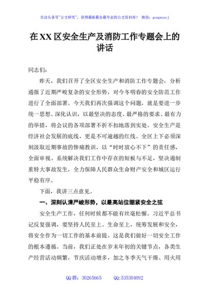/ 在XX区安全生产及消防工作专题会上的讲话