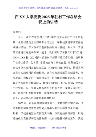 / 在XX大学党委2025年驻村工作总结会议上的讲话