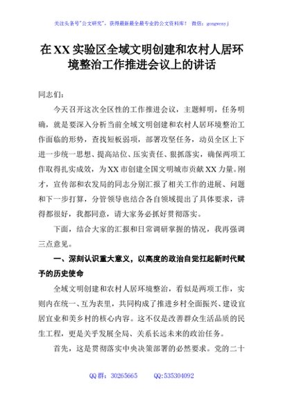 / 在XX实验区全域文明创建和农村人居环境整治工作推进会议上的讲话