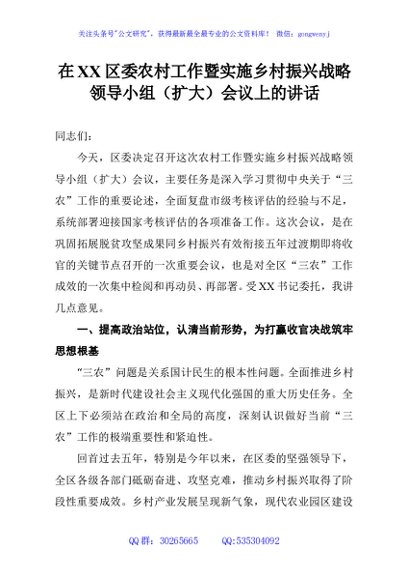/ 在XX区委农村工作暨实施乡村振兴战略领导小组(扩大)会议上的讲话