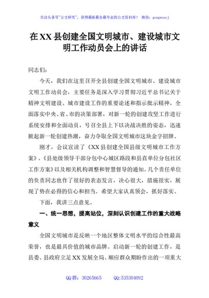 / 在XX县创建全国文明城市、建设城市文明工作动员会上的讲话