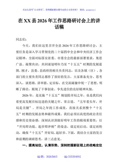 / 在XX县2026年工作思路研讨会上的讲话稿
