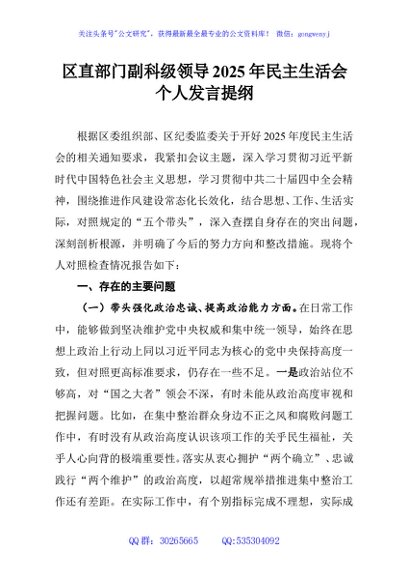 / 区直部门副科级领导2025年民主生活会个人发言提纲
