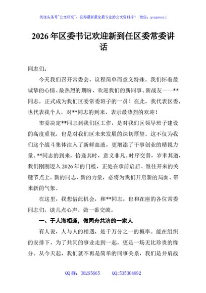/ 2026年区委书记欢迎新到任区委常委讲话
