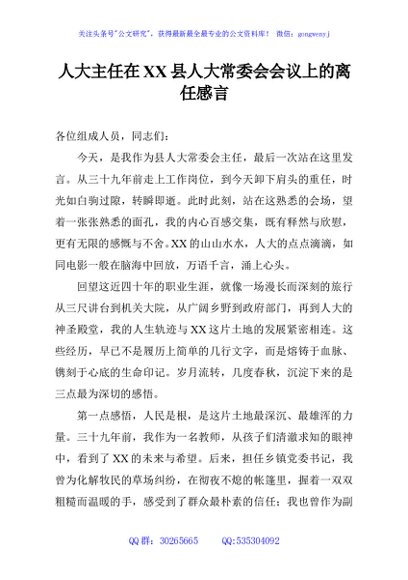 / 人大主任在XX县人大常委会会议上的离任感言