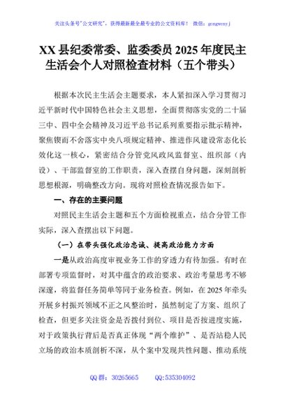/ XX县纪委常委、监委委员2025年度民主生活会个人对照检查材料(五个带头)