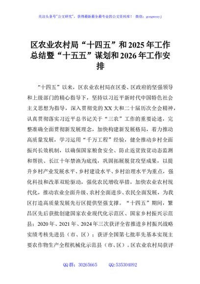 / 区农业农村局“十四五”和2025年工作总结暨“十五五”谋划和2026年工作安排