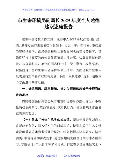 / 市生态环境局副局长2025年度个人述德述职述廉报告