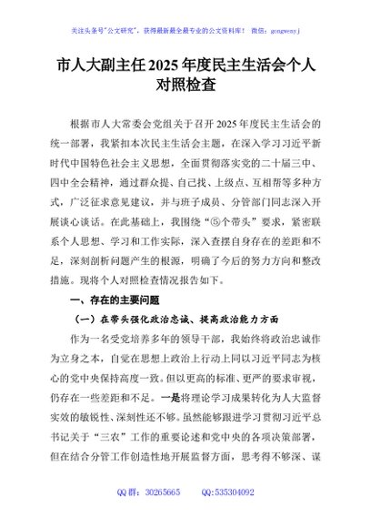 / 市人大副主任2025年度民主生活会个人对照检查