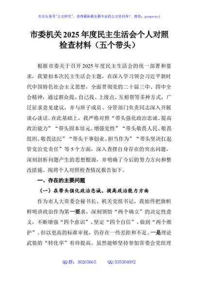 / 市委机关2025年度民主生活会个人对照检查材料(五个带头)