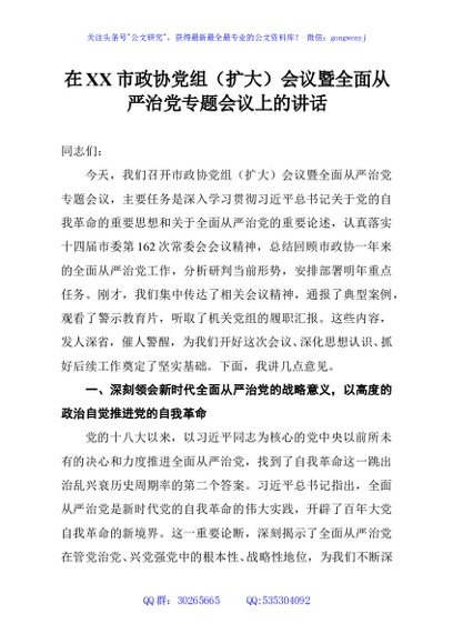 / 在XX市政协党组(扩大)会议暨全面从严治党专题会议上的讲话