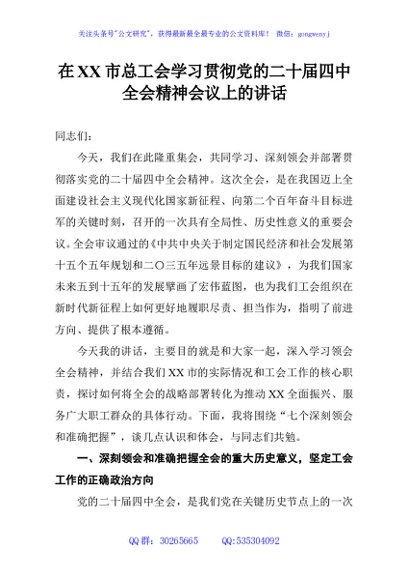 / 在XX市总工会学习贯彻党的二十届四中全会精神会议上的讲话