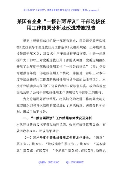 / 某国有企业“一报告两评议”干部选拔任用工作结果分析及改进措施报告